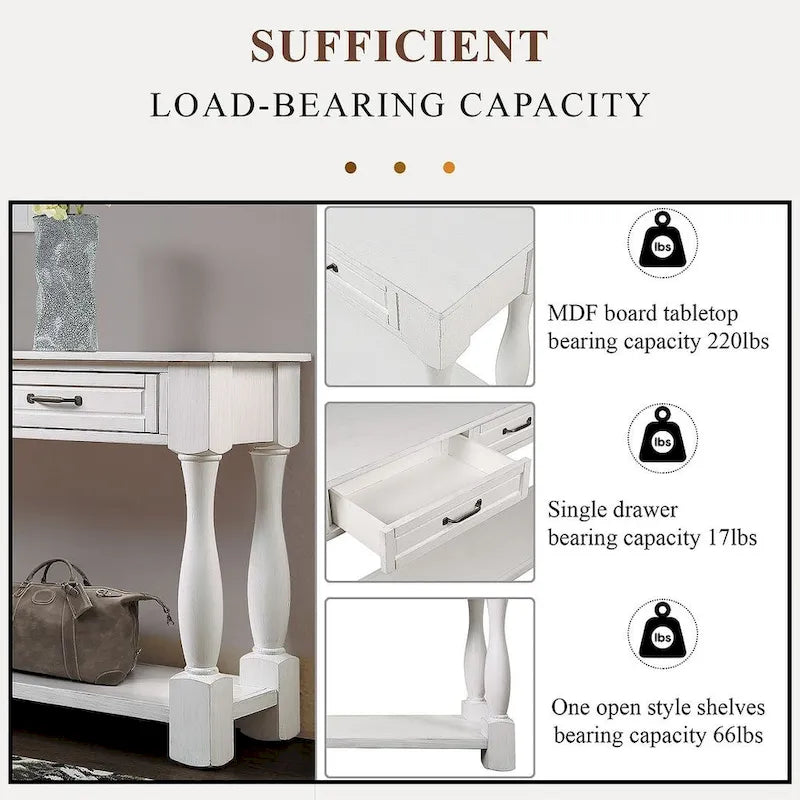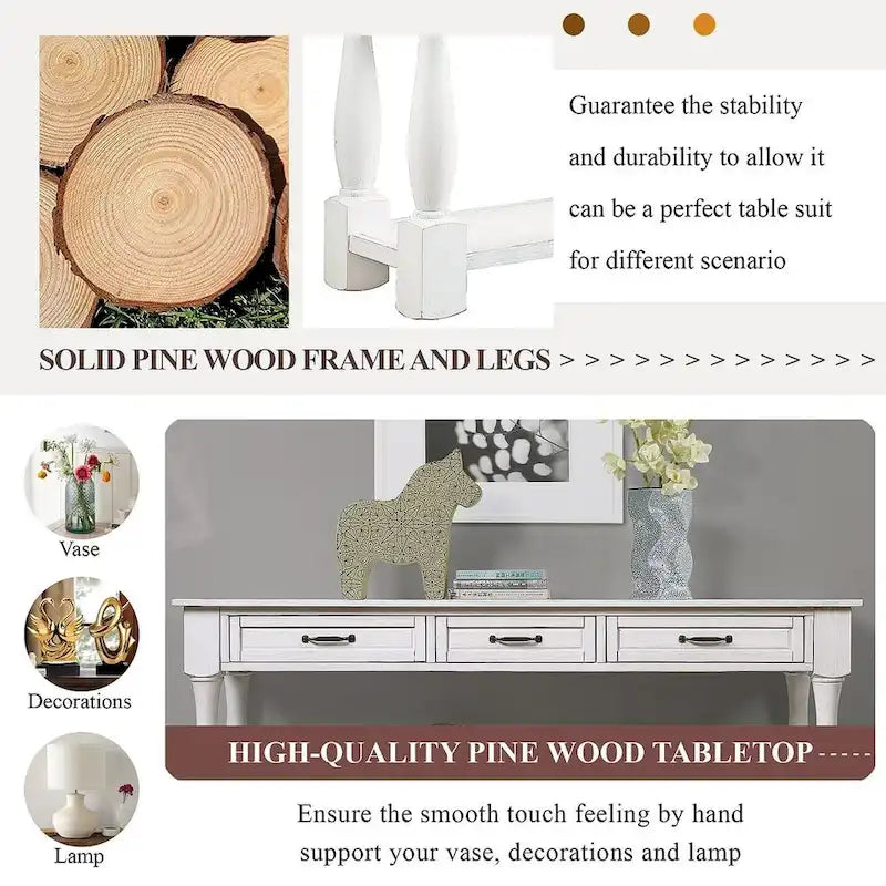 Elevate your living space with our 63-inch Wood Console Table. Crafted from solid pine, this American-designed piece exudes a perfect blend of retro and modern style. The distressed finish adds character, while the extra-thick legs ensure stability. With three drawers, a bottom shelf, and a spacious tabletop, it offers ample storage for daily essentials. Easy assembly, with tools included, makes setup a breeze.
