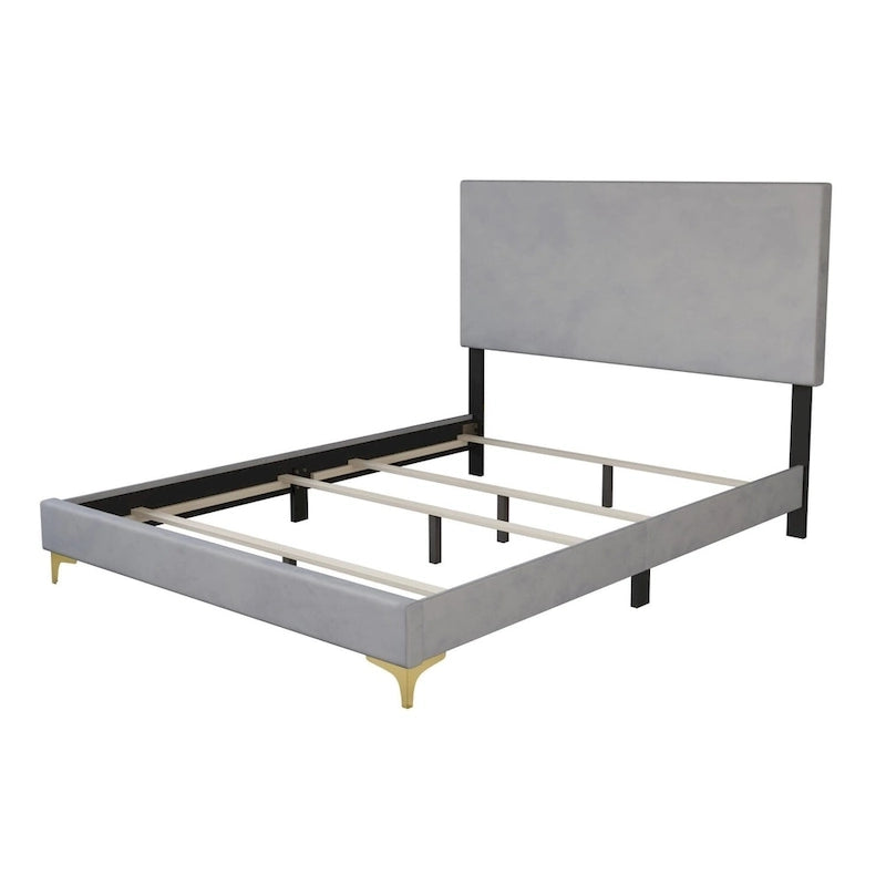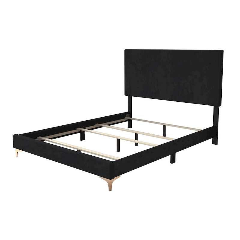 Elevate your bedroom with this simple yet modern design upholstered panel bed. The simple and clean-lined headboard wrapped in smooth velvet and cushioned with foam-filling offers comfort behind your head while you catch up on some late-night reading. In addition, it features two legs with gold-tone color to give the glam look you love. Available in different stylish colors and sizes to easily match a variety of styles.