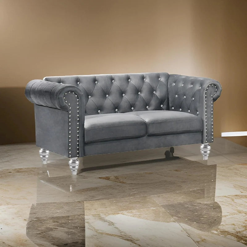 Ben 62 Inch Velvet Loveseat with Crystal Tufted Back, Grey