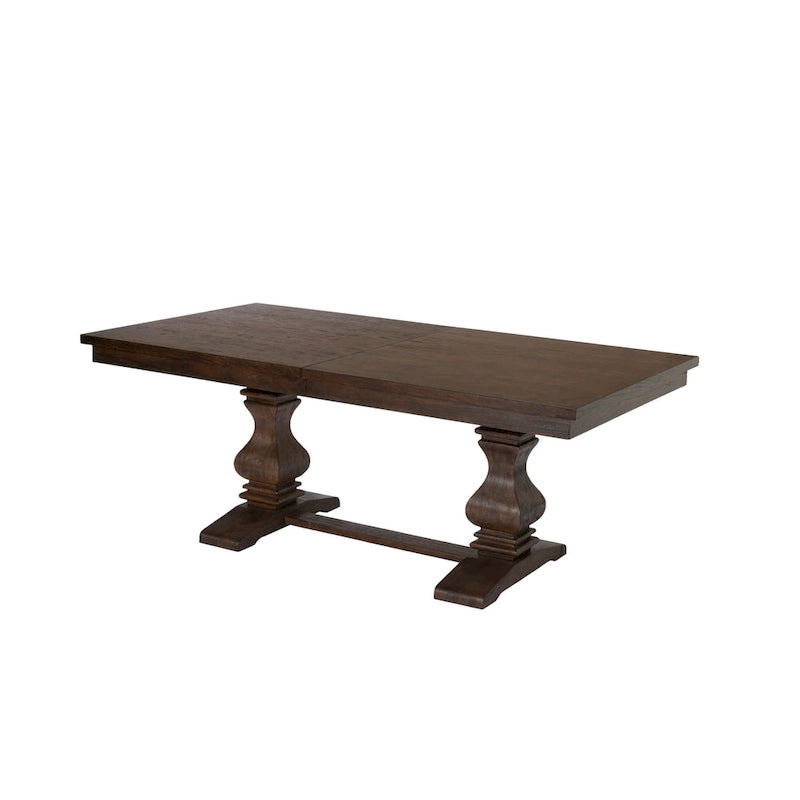 Gather around this sophisticated 9-piece extension dining set for an elegant and grand dining experience. The traditional style and luxurious walnut finish of the wooden table exude quality and longevity. The trestle double-pedestal base adds a regal touch while the extension leaf allows for more seating options. The chairs have a stylish beige or grey linen upholstery with nailhead trim, button tufted backs, and wooden legs in a matching walnut finish. This set includes 1 extension dining table and 8 dining chairs.
