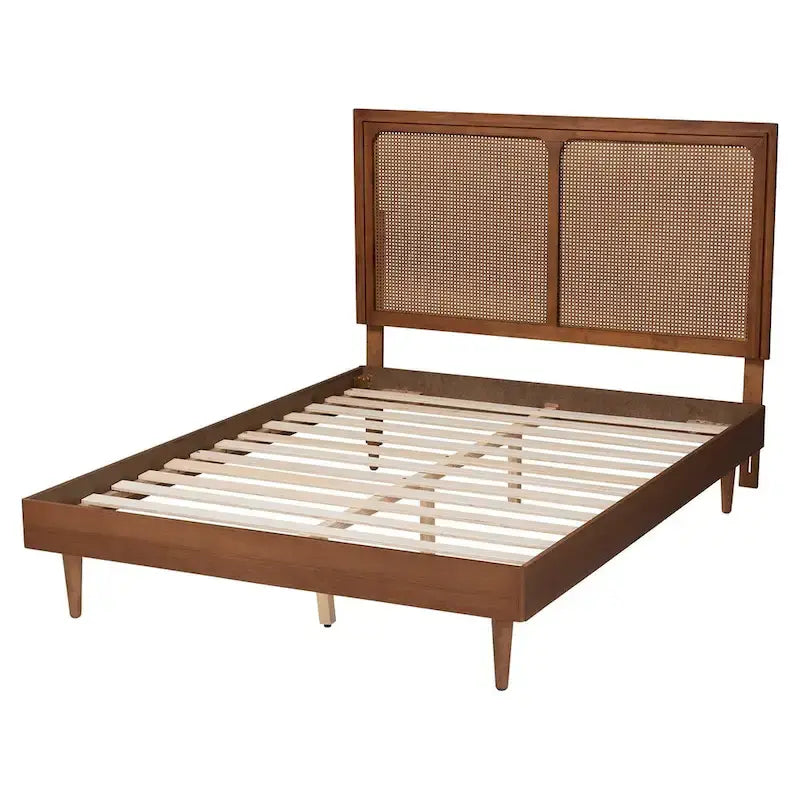 Materials: Rubberwood with MDF Ash Veneer, Synthetic Rattan(Headboard Panel), LVL Color(s): Walnut Brown Constructed from Rubberwood and Engineered Wood Woven synthetic rattan embellishments Wood slats eliminate the need for a box spring Paneled headboard frame Includes: One (1) Queen Size Bed Frame; One (1) Queen Size Headboard Care instruction: Wipe Clean
