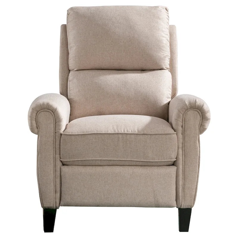 How can a tried-and-true classic be made better? Just add a reclining function! Poised to become your new favorite piece of furniture, this classical-style chair combines must-have style with relaxation. Its frame sits solid wood legs and is swathed in upholstery accented by rolled arms and characteristic arm. With a push, this design leans back, making the perfect perch for curling up with your latest read or napping the afternoon away.