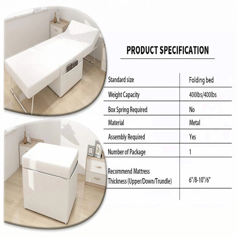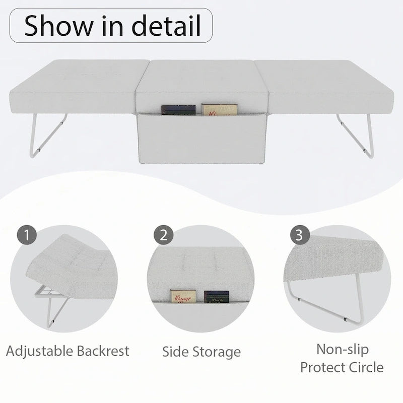 Product FeaturesEasy to Store Folding Bed: This convertible sleeper chair can be easily and quickly converted into square chair to meet your needsHigh-quality Material: The folding convertible chair bed is made of an iron frame with a maximum capacity of up to 550 lbs. High-density sponge makes the sofa elastic, Perfect for sleeping or restingAdjustable Backrest: This single sleeper sofa chair has adjustment backrest, which can be adjusted to make you feel perfectly supported and extra comfortable whether you are sitting or lying on this sleeper chairNon-slip Foot Pads: anti-skid foot pads are attached at the bottom to enhance safety. Reduce noise and keep you safe. It also prevents the floor from being damagedSpace-Saving for Wide Application: This folding stool bed features compact size and won't occupy much space, which makes it possible for you to use it for office nap or place it in your RV for long-distance travelingKeep it looking its best1.Fabric furniture Care;Dust regularly. Clean gently with a clean, slightly damp cloth. Professional cleaning is recommended.2.Wood Furniture Care:We recommend dusting frequently with a clean, soft, dry, lint-free cloth. Clean the surface by rubbing in the direction of the grain and wipe dry.3.Avoid direct sunlight.4.Avoid the use of all chemicals, household cleaners, abrasives, or cleaners that contain lemon, vinegar, or other acids that may damage the finish.5.Do not place hot appliances, such as curling irons and hot hair dryers directly on the countertop.6.Spot clean using distilled water and water-based cleaning agents, foam or mild water-free cleaning solvents. 7.Always test a small inconspicuous area first.8.Hardware may loosen over time; periodically check to make sure all connections are tightNotes1.Size Notice:Manual measurement has been used, there may be some reasonable errort, thanks for your understanding.2.Color Notice:Due to factors such as display equipment and shooting environment, the color of the item may be slightly different from the picture, which is a normal phenomenon, please refer to the actual item3.Assembly Notice:Please read assemble manual in advance. Please do not over-tighten nuts, as this may cause distortion or breakage.4.It is recommended to put a layer of foam or soft cushion on the floor when installing to avoid scratching the floor.5.If the item has any defects, damage or missing parts, please contact us with pictures or videos so that we can understand your needs and help you quickly, and always remember to retain its original packaging to ensure any return requests. We will try our best to solve any problems you may have.6.If you receive the wrong product, please attach the product picture, the infographic of the outer package and the picture containing SKUs, so that we can verify and quickly deal with it for you