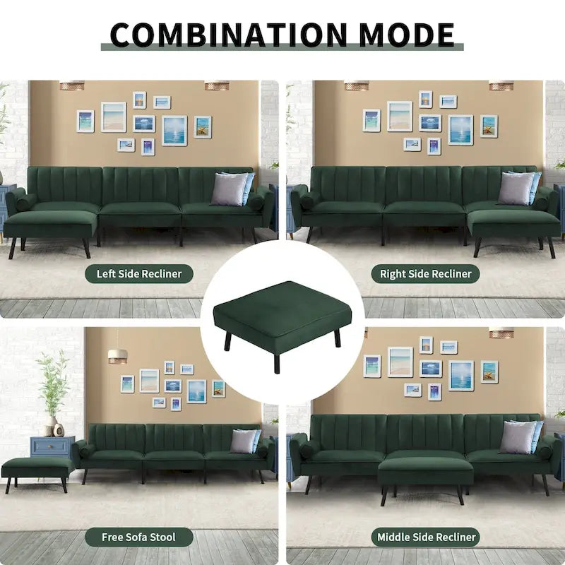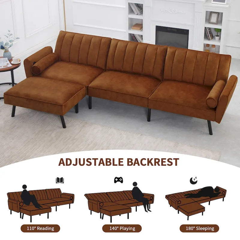 Our convertible futon sofa bed transforms effortlessly from a futon to a comfy bed in seconds, ideal for naps or guests. Adjustable backrest with 110, 140, and 180 angles caters to all your comfort needs. The separate backrest of the velvet sleep sofa bed allows for individual adjustments without disturbing others. Convenient side pockets keep essentials within reach. A 21-inch deep seat offers generous relaxation space. Soft, anti-pilling velvet ensures durability, while the movable ottoman provides flexible placement. This L-shaped sofa adds modern elegance to any room.