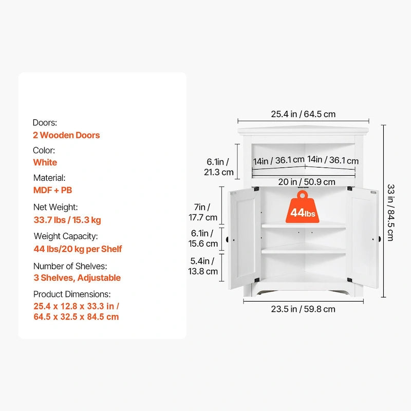 Corner Cabinet 32 with 2 Doors and Adjustable Shelves for Home Storage - 25.4 x 12.8 x 33.3 in
