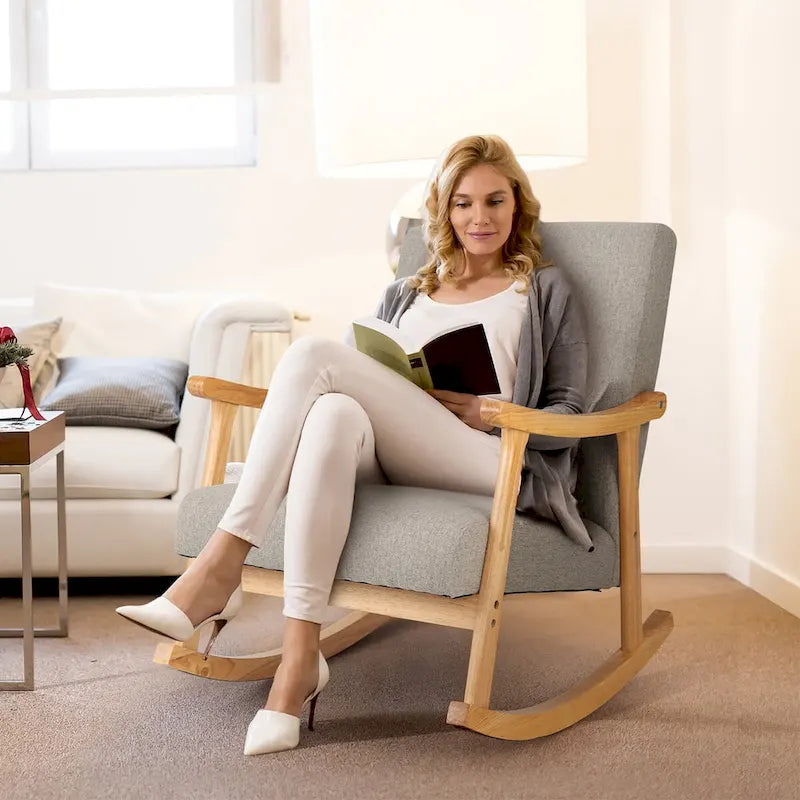 Our rocking chair is a great choice for your living space, and can fulfill your needs of reading books, watching TV, playing games or taking a nap. With reinforced rocking feet and anti-slip felt pads, you are allowed to rock forward and backward gently. Solid rubber wood frame makes it strong and sturdy enough to serve you for years. Besides, covered with high-quality faux linen fabric, this accent rocking chair is filled with soft and comfortable sponge. So you wont feel uncomfortable when sitting for a long time. Whats more, its also designed with padded backrest, 103-degree backrest angle and curved armrest to add more comfort.