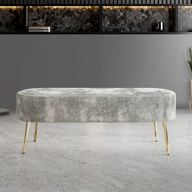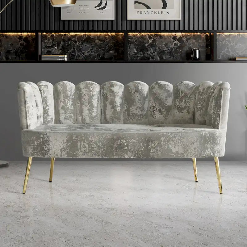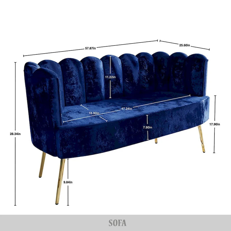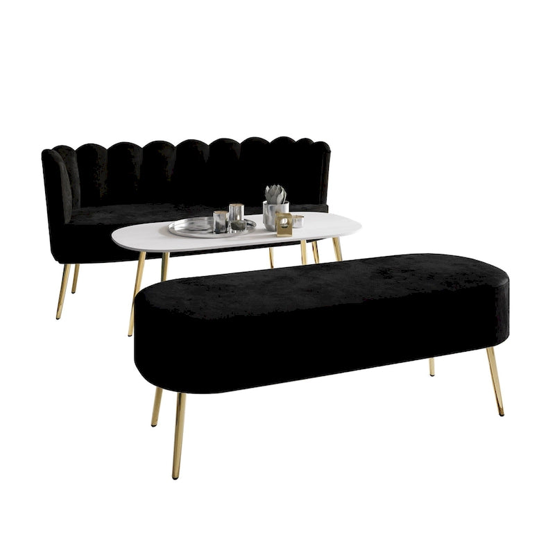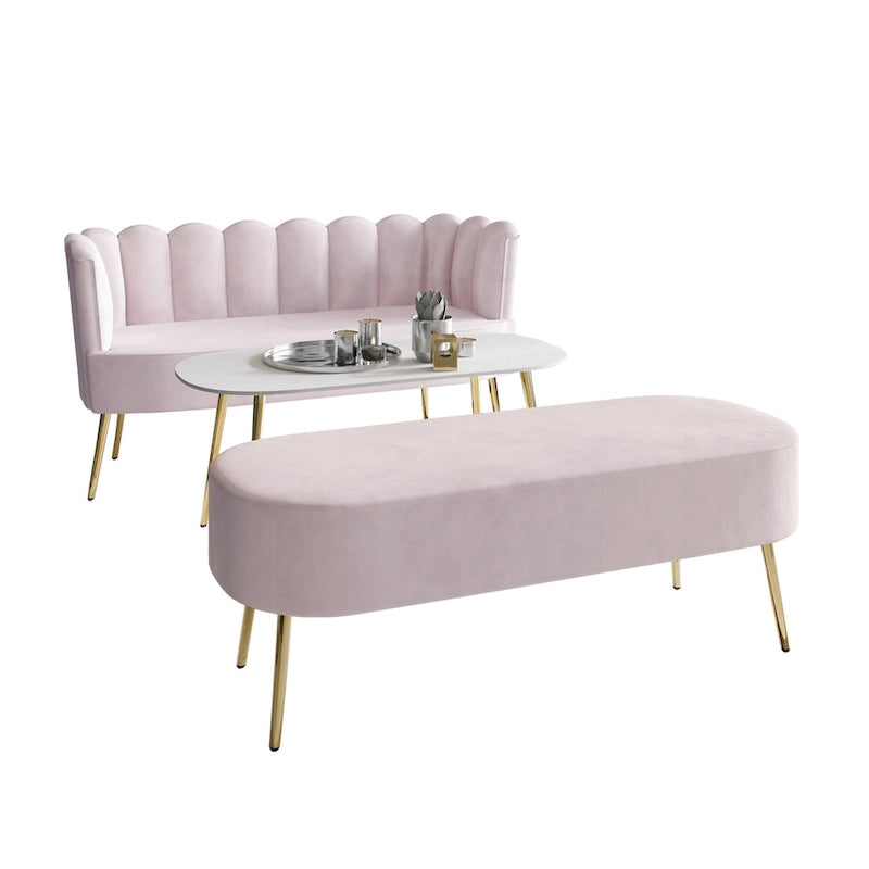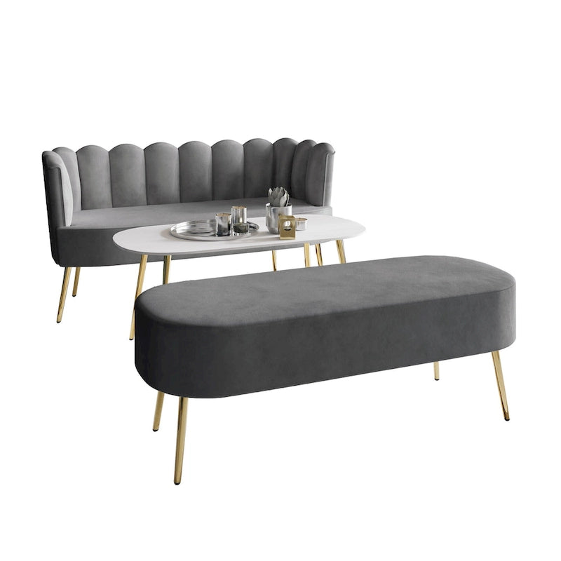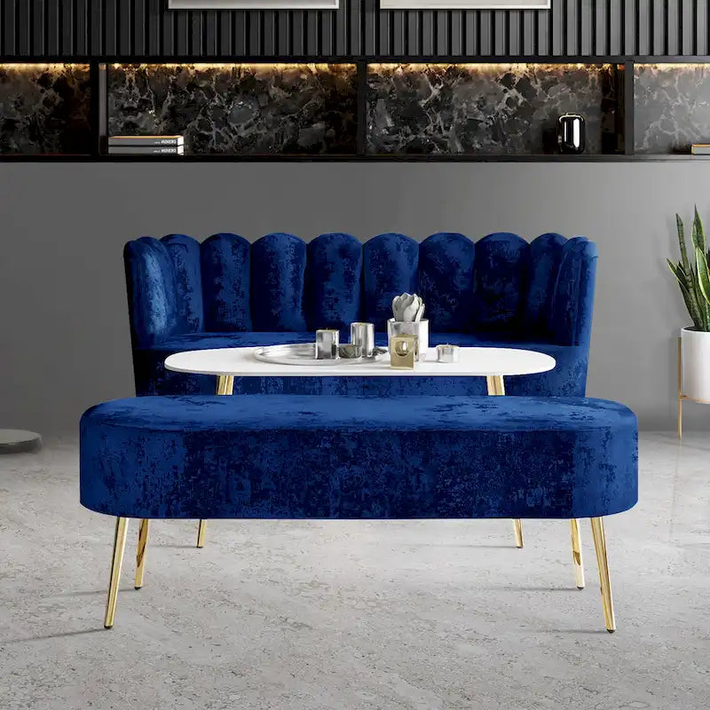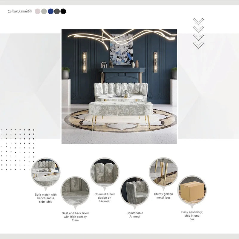 Revamp your living space with the modern and elegant American Style Living Room Set that includes a 58 sofa, matching bench, and coffee table, perfect to suit any home decor. Crafted with solid wood, this set boasts sturdy golden metal legs that offer an upscale look and stability. The 58 sofa and bench feature an ergonomic design, providing a comfortable seating experience. The cushions are padded with high-density foam, which offers unmatched comfort, and they are upholstered in skin-friendly velvet available in five exquisite colors: Light pink, Black, Navy blue, Silver grey, and Light grey.