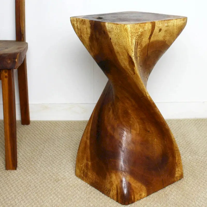Need a unique functional one of a kind accent table that doubles as a bar stool or display stand?Nature's creations are always in style; this dramatic accent piece is a stylish complement to both traditional and contemporary settings.A single graceful half twist creating the perfect display stand. Each piece is hand crafted, kiln dried, and elegantly finished to show off the beauty of the natural wood and craftsmanship of the piece. Carved from a single piece of sustainable, lustrous Monkey Pod wood, each Stool or Display Stand is a work of art itself, and can be lit from above or below to show off the unique curves and grain of the piece. At 12 inches square and 24 inches highHand rubbed in natural nontoxic Walnut tone oil that is polished to a matte finish. Color ranges from medium to dark Walnut brown tones that will darken as the wood ages*Please Note* There will be various separations or cracks and color will vary from the pictures depicted for every single piece. No two pieces will matchThe handcrafted touch of artisan skill creates variations in color, size and design. Color discrepancies will occur between the product and your computer screenThere will be visible marks from carving, patches from repairs, knot holes, natural inclusions, various separations, and worm holesHand made from start to finish. 100% Sustainable eco friendly woods and finishesEach piece hand carved from a solid piece of sustainable wood. Craftspeople from the Chiang Mai area in Northern Thailand create these one-of-a-kind pieces with the simplest of tools. Each piece is a unique creation, more than a piece of furnitureit is a Work of ArtOnly listed product included