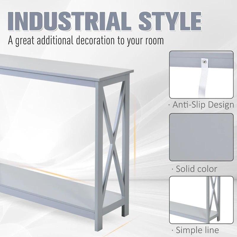 This HOMCOM console table with simple grey finish will match the style of your current home! This entry table works great as a console table, entryway table, display table, or really anything else you may need. Easy to complement your home decor and highlight your taste, this sofa table features simple lines and a class farmhouse aesthetic. Made of P2 certified MDF board to ensure longlasting use, you know your hallway storage console will last you a long while. Checkout our console table and finish your home decor.