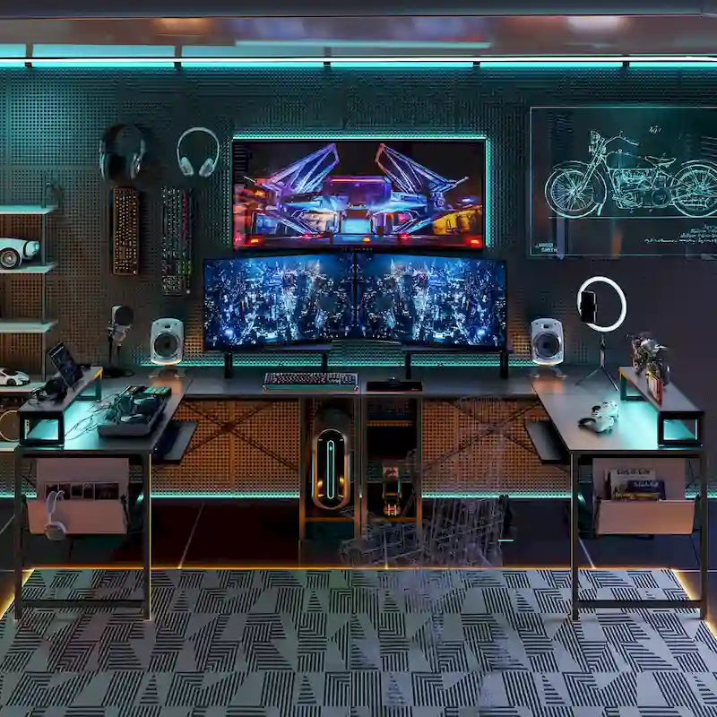 Bring your gaming and work experience to the next level with the Bestier L Shaped Desk LED 95.2 Inch Computer Corner Desk. This desk features an RGB LED light strip with 7 main colors and 20 dynamic modes to create a vibrant and immersive gaming atmosphere. The desk also comes equipped with dual monitor stands that reduce neck and back pain and a spacious keyboard tray with smooth sliding steel tracks. Choose between a 59.5 inch L-shaped desk or a 95.2 inch double long desk configuration to fit your specific needs. The desk also includes flexible storage shelves to keep your workspace organized.