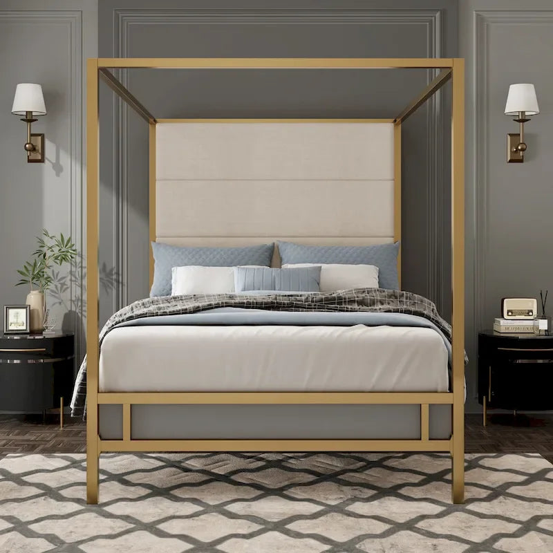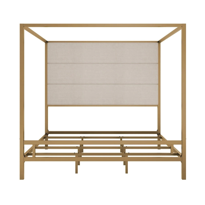 This stunning metal canopy bed combines elegance, comfort, and functionality. The tall upholstered headboard offers both support and style, while the sturdy metal frame provides long-lasting durability. With an elevated design for storage and an easy assembly process, this bed is a perfect addition to any modern bedroom. A box spring is required for optimal comfort.