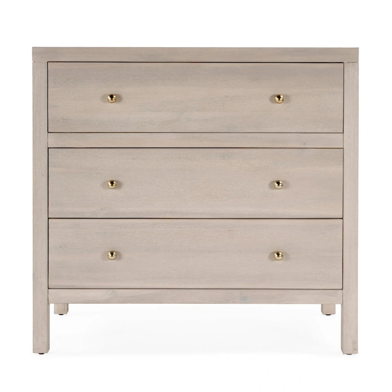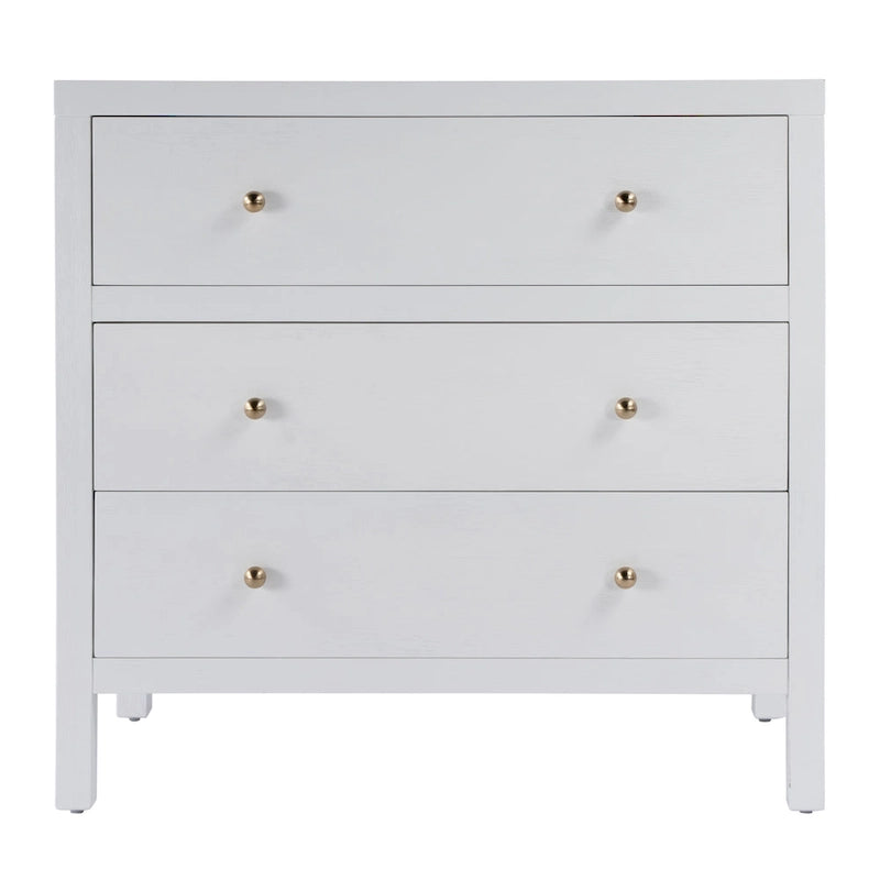 - Features 3 drawers with round pull hardware made from zinc alloy and finished in an unlacquered gold