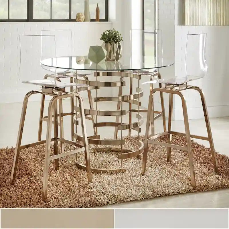 This round, glass-top Nova dining table from iNSPIRE Q Bold is an eye-catching statement piece that's sure to impress your guests. A work of art in and of itself, the sturdy metal base takes cues from art deco elements fused with a sleek and contemporary open design. Perfect for limited spaces or eat-in kitchens, the table's size is convenient while still large enough to meet all your everyday and entertaining needs. Available in a modern chrome finish or warm champagne gold finish.