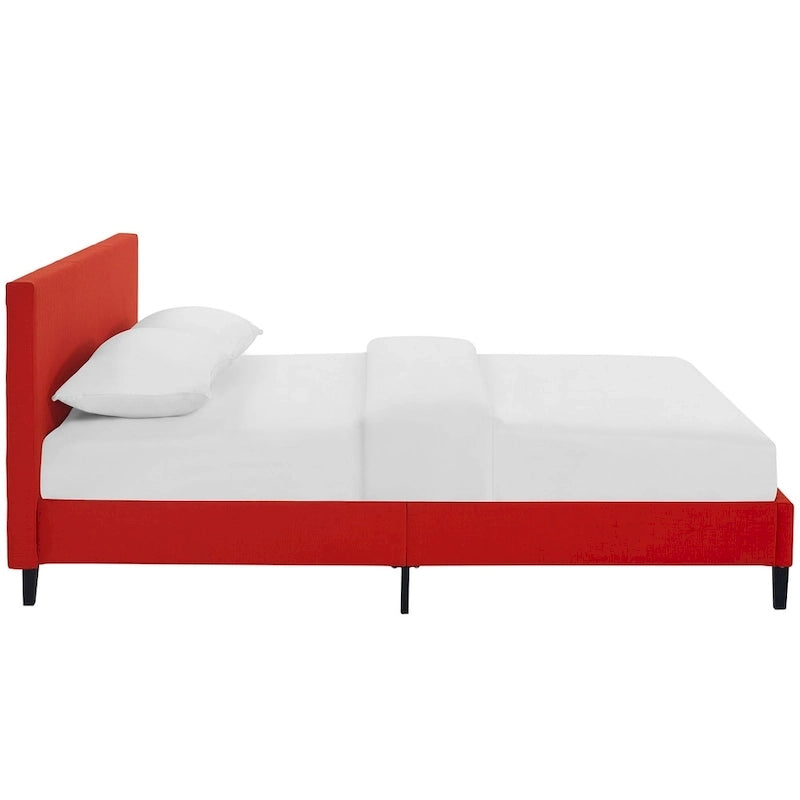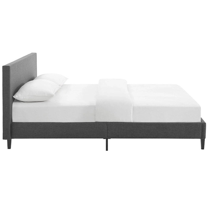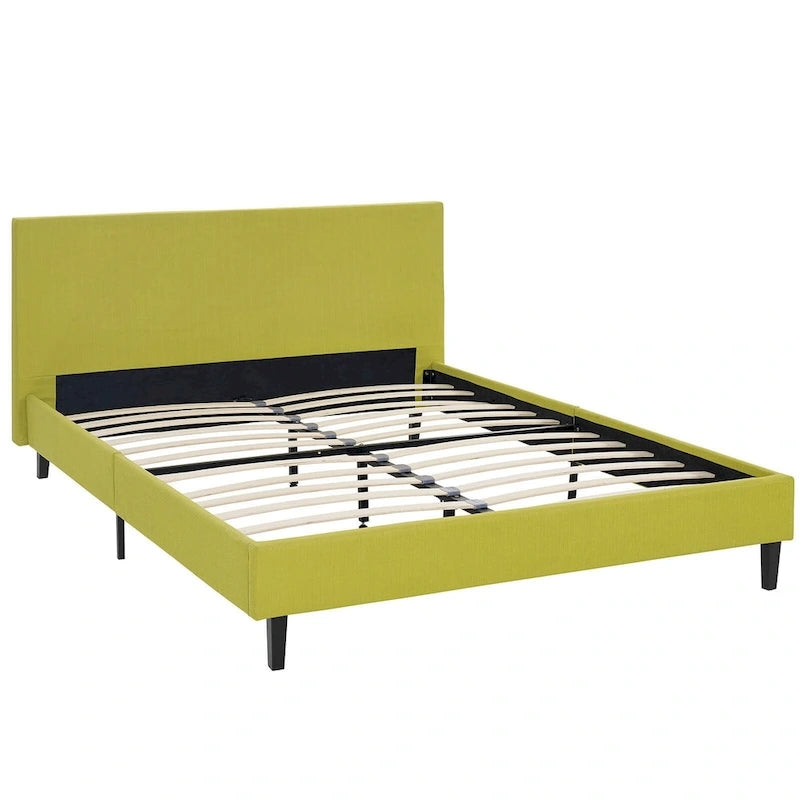 - Platform bed frame with padded vinyl headboard and sturdy plywood base