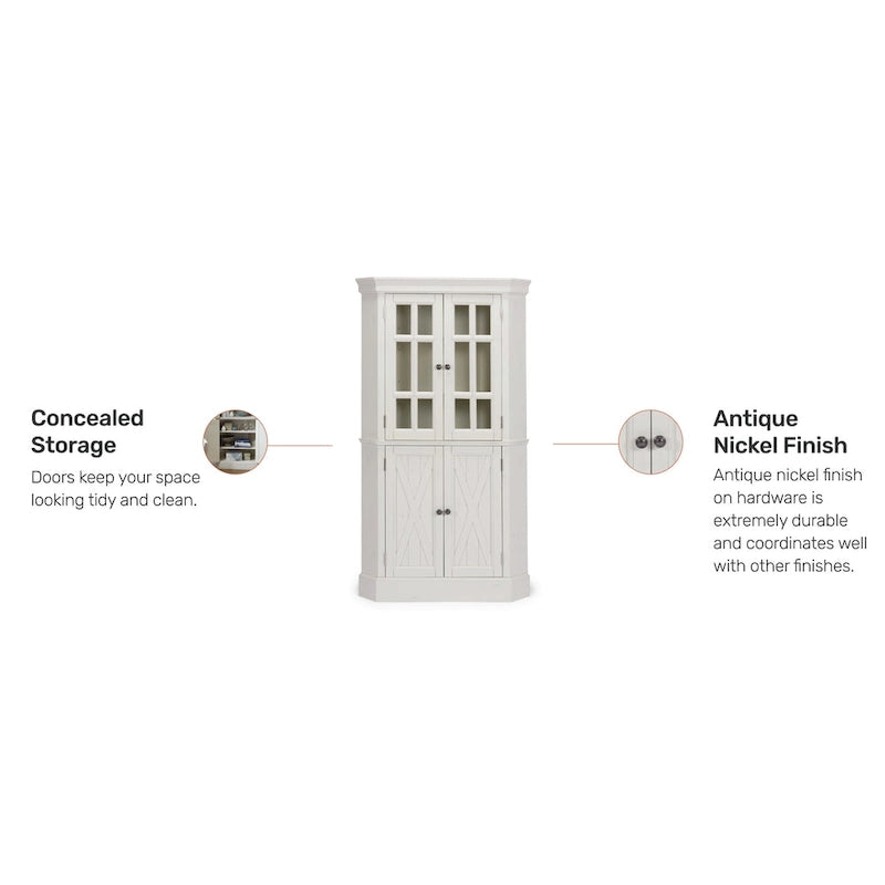 Store and display your cherished items with the Homestyles Seaside Lodge Corner China Cabinet. Featuring glass cabinet doors to showcase your valuables or wood doors to conceal storage, this durable cabinet offers ample storage space for any room in your home. Crafted from a combination of hardwood and engineered wood, this piece is built to last and boasts a refined, timeless off-white finish. The aged finish adds character and unique charm to this one-of-a-kind cabinet.