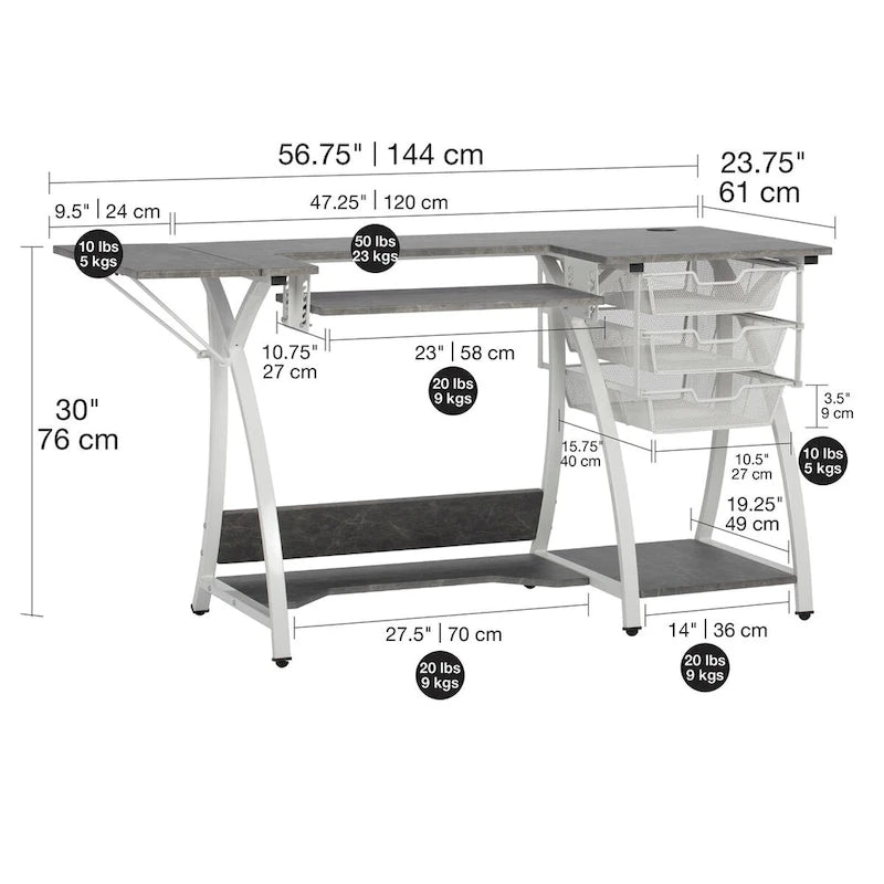 - Weight Limit: Top - 50 lbs., Sewing Platform, Bottom and Right Shelf - 20 lbs. each, Folding Shelf and Drawers - 10 lbs. each